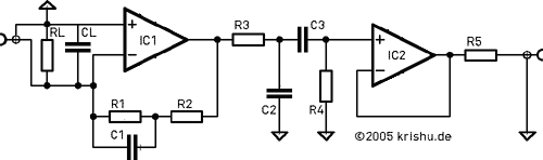 Die zweite OPV-Stufe hat dieses »Feature« nicht, die geringe Verstärkung dieser macht das sicher überflüssig. Wenn wir schon dabei sind, (suspekte) Bauteile zu sparen, können wir die ohnehin geringe Spannungsverstärkung auch gleich auf 1 (also als Puffer) setzen. Dadurch fallen R4 und R5 komplett weg. Wieder Geld gespart. Das Ergebnis sieht dann so aus: