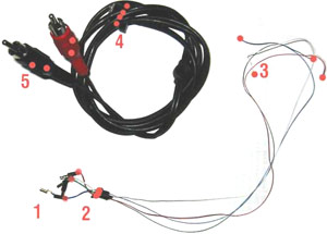 die Originale Verkabelung: oben das Außenkabel mit den RCA-Steckern, unten die Innenverkabelung.