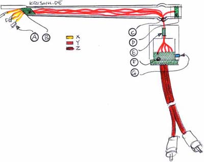 Die Verkabelung wie auch die Stecker der Originalversion sind alles andere als optimal: zahlreiche Lötstellen, drei verschiedene Kabel, unbehandelte Tondosenstecker (das Kupfer wird schnell grünschwarz, d.h. oxoidiert, der Elektrische Übergang ist fraglich) an dem einen, vernickelte RCA-Stecker an dem anderen Ende.