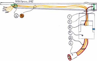 2. Löst man die kleine Innensechskantschraube (G) am Befestigungsgewinde der Armbasis und zieht das Außenkabel (Z) (mitsamt der Montageplatte (F)) heraus, lötet mit Geduld die Innenkabel (Y) ab oder schneidet sie ohne Geduld einfach möglichst nah an der Montageplatte ab.