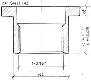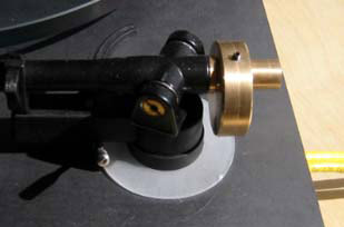 Vom Original abweichende Tellerdicken erfordern eine Höhenverstellung (VTA) für den Tonarm, welche völlig simpel aufgebaut sein kann. Siehe links. Zum Schutz des Gewindes der Tonarmbase kann dort eine dünne, straff sitzende Metallhülse mit der Befestigungsmutter des Tonarms aufgeschraubt werden.