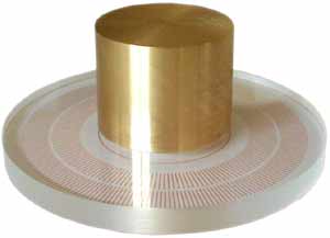Stroboskopmuster auf dem Plattengewicht. Um die Geschwindigkeit über den gesamten Radius der Platte beim Abspielen dieser messen zu können, habe ich ein Plattengewicht mit Stroboskopmuster gebaut. Aufgrund des geringen Platzes ist die Anzahl der Striche auf 150 Hz ausgerechnet, da der Platz für mehr nicht ausreicht.